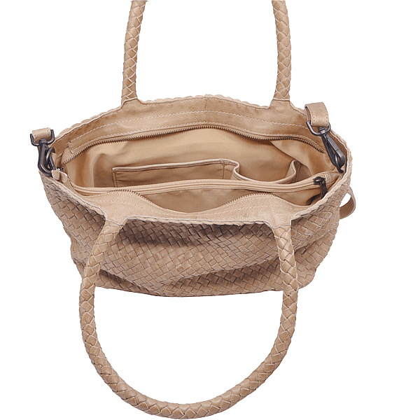 innen Reissverschlussfach, Steck- und Handyfach, pflanzlich gegerbtes Vollrindleder, geflochten