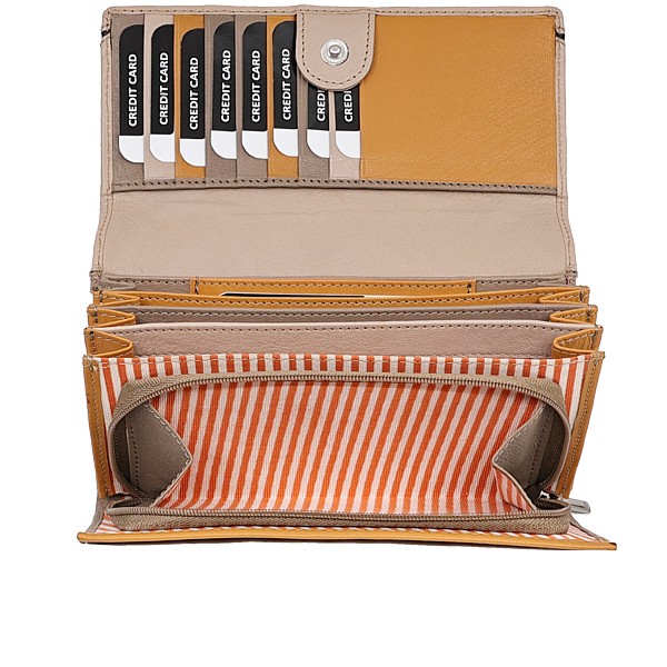 2 teiliges Reissverschlussfach, 4 grosse Fächer, 7 Kartenfächer, 3 Steckfächer, Rindleder, in rot, blau und gelb