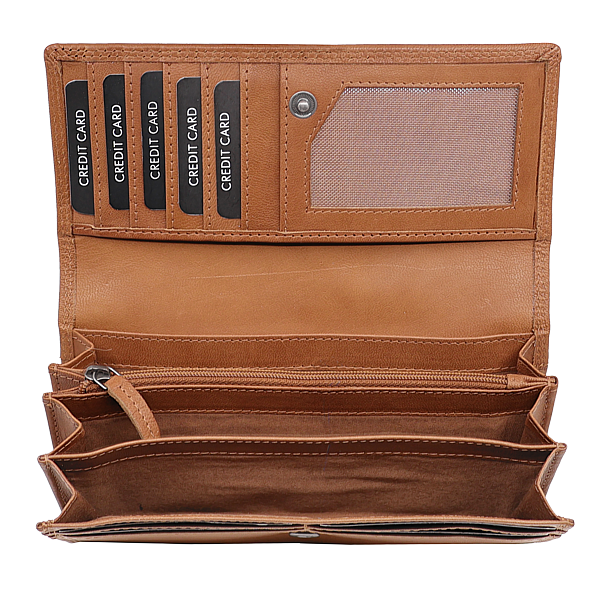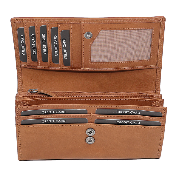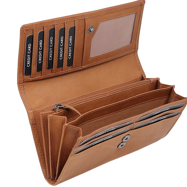 16 Kartenfächer, RFID safe, 2 Sichtfächer, 5 Steckfächer, Notenfach, 2 teiliges Reissverschlussfach, naturbelassenes, leicht gewachstes Ziegenleder