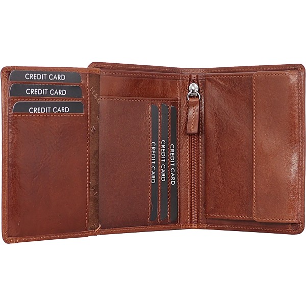 8 Kartenfächer, RFID safe, 3 Steckfächer, Sichtfach, 2 Notenfächer, Münzfach, pflanzlich gegerbtes Vollrindleder