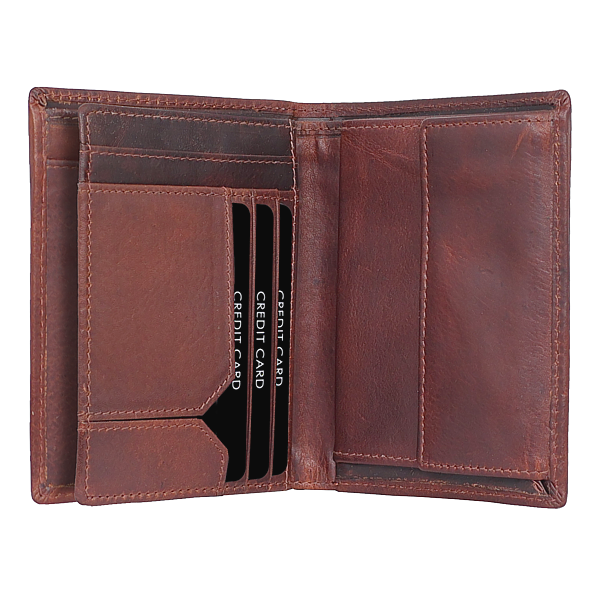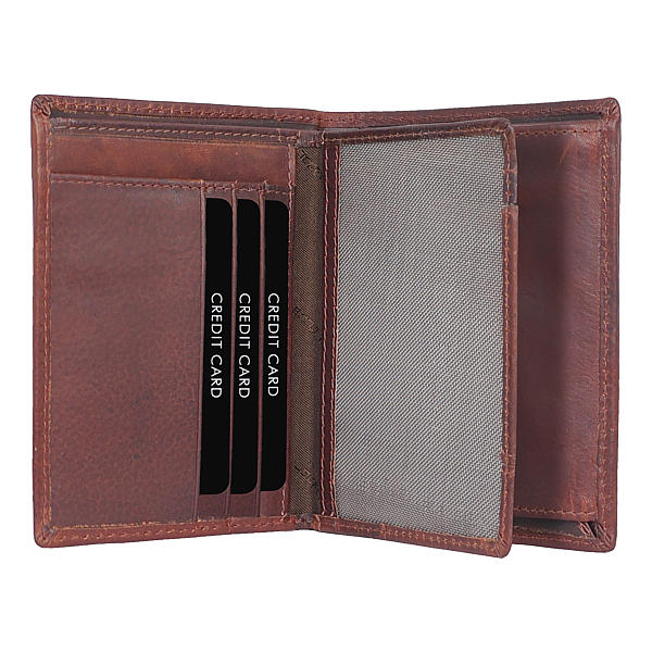 6 Kartenfächer, Sichtfach, 4 Steckfächer, Reissverschlussfach, geöltes Vollrindleder naturbelassen, in braun und camel